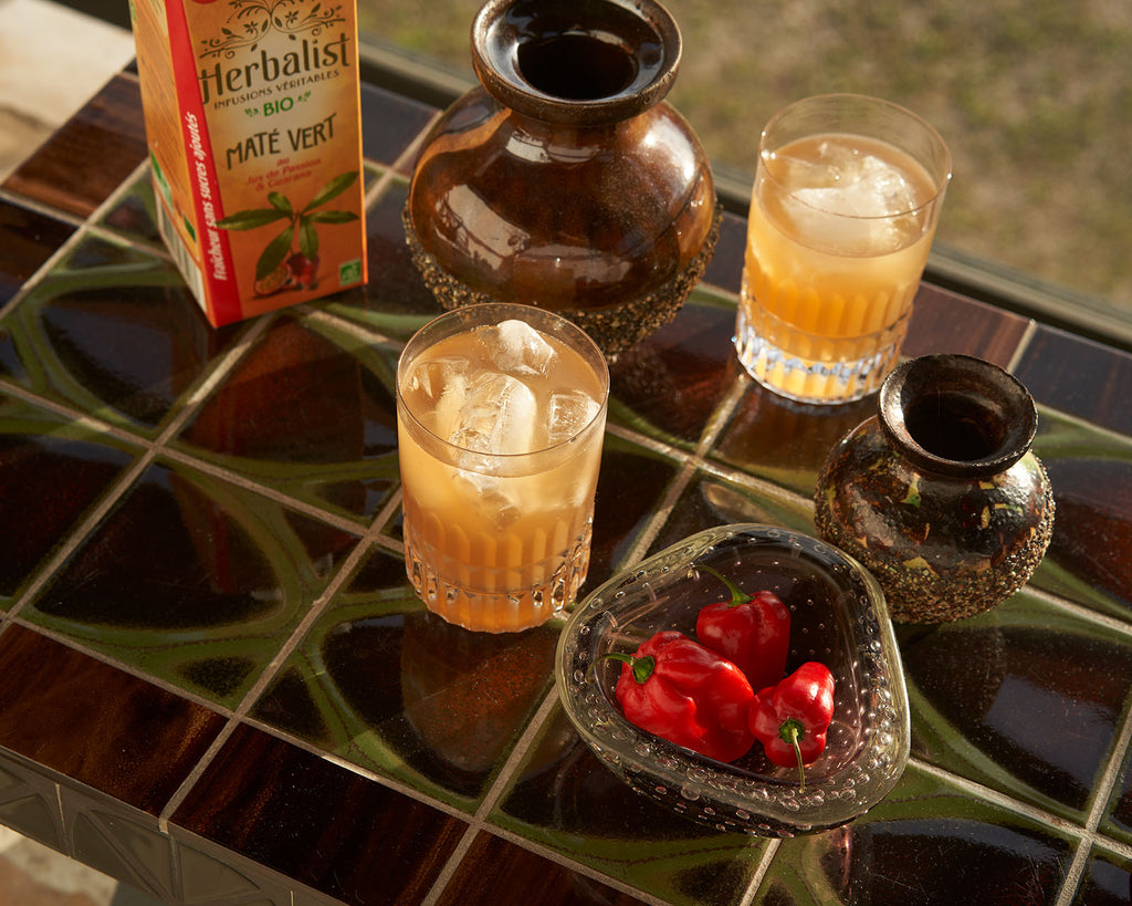 The traditional pressing of green tea leaves or green mate releases natural caffeine which associated with lemon contributes to drainage and clearance.